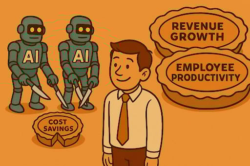 It is tempting to look for a return on your AI spend so that it is cost neutral immediately. Whilst this would be great, bear in mind that this normally leads to an outsized focus on giving evidence that a project has made a difference. It is highly likely that projects will take the majority of a year to come online, so there has to be an understanding there will not be immediate payoff from starting an AI project. Further, in order to show an immediate return, cost savings are often the focus as they are the easiest to evidence on the bottom line. Too often, ROI gets reduced to cost to implement vs cost saved, and companies are taking the same view of AI ROI. Cost savings, however, are the smallest part of the equation. Larger ROI comes from productivity gains that compound, from employees who are happier and more empowered using tools that are more efficient. Cutting costs gives you a one-time, capped boost. Empowering people fuels your growth year after year.