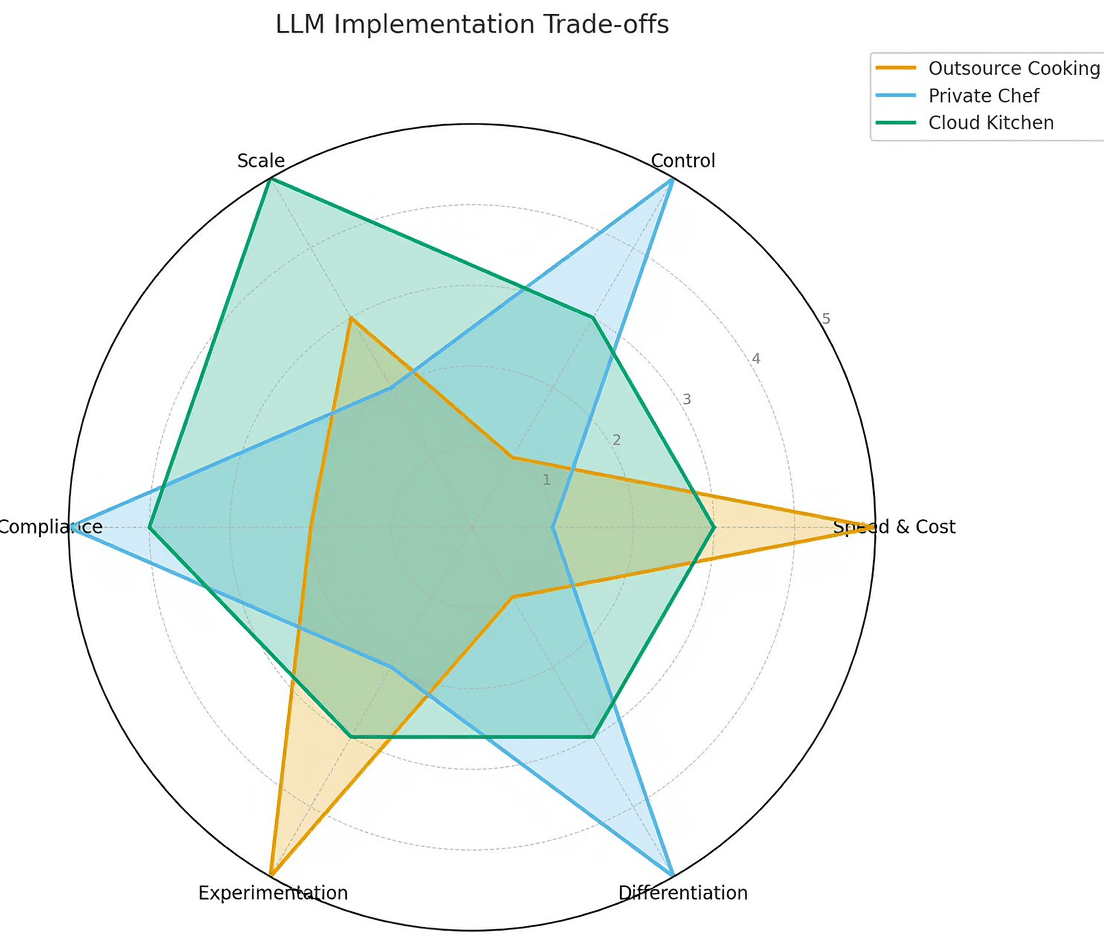 Bringing an LLM into your firm is a lot like deciding how you’ll eat. We’ve already covered the ingredients you will need to make an AI strategy real. Now comes the architectural choice: do you completely outsource the cooking to a restaurant, hire your own private chef who learns your tastes or co-hire a chef in a shared cloud kitchen?